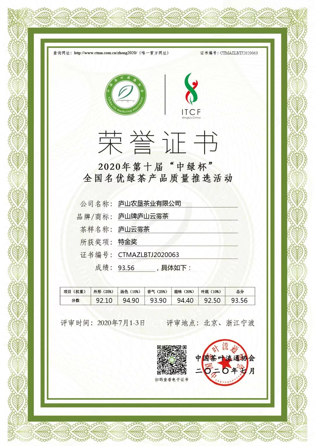 2020年第十屆“中綠杯”金國名優綠茶產品質量推選活動 榮獲 特金獎