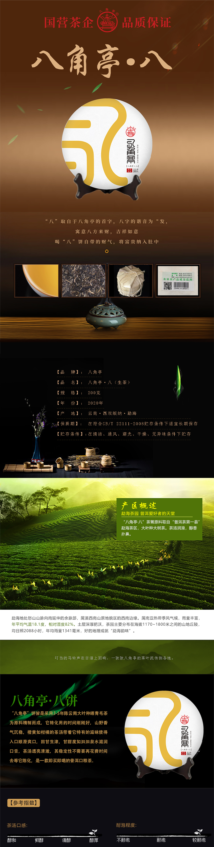 八角亭茶業原為黎明農工商聯合公司(黎明農場)下屬茶葉加工組,始于一九六四年,從事茶葉產品開發生產五十余載,一九八四年建成標準化工廠,二00一年開始生產普洱茶,截止到2013年,公司累計生產各種普洱茶數百個品種共12000余噸。