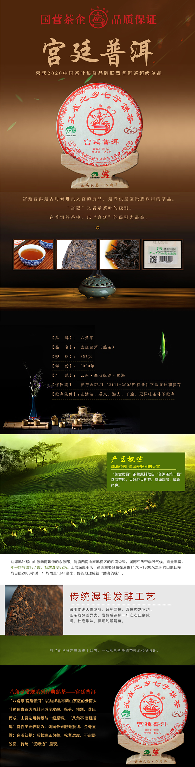 云墾茶業(yè)集團(tuán)下屬茶葉生產(chǎn)企業(yè)——云南農(nóng)墾集團(tuán)勐海八角亭茶業(yè)有限公司原名黎明茶廠(chǎng),是我國(guó)歷史最為悠久的茶企之一,曾位列“中國(guó)普洱茶十大知名品牌”“十大最受歡迎茶葉品牌”、“中國(guó)普洱茶十大暢銷(xiāo)品牌”中,成為今天市場(chǎng)上最有影響力的品牌之一。公司產(chǎn)品獲得“綠色食品”、ISO9001、 HACCP和云茶品牌(YC)4項(xiàng)認(rèn)證,連續(xù)獲得“云南名牌農(nóng)產(chǎn)品”“云南名牌產(chǎn)品”“云南省著名商標(biāo)”等品牌榮譽(yù),公司生產(chǎn)的多款普洱茶在歷次專(zhuān)業(yè)評(píng)比中多次獲得特等金獎(jiǎng)和金獎(jiǎng)。在2018第五屆中國(guó)企業(yè)五星品牌論壇上,云南農(nóng)墾集團(tuán)勐海八角亭茶業(yè)有限公司上榜中國(guó)普洱茶行業(yè)影響力品牌——“金芽獎(jiǎng)”,公司負(fù)責(zé)人陳勝軍先生獲“陸羽獎(jiǎng)”,被授予2017“國(guó)際十大杰出茶人”榮譽(yù)稱(chēng)號(hào)。