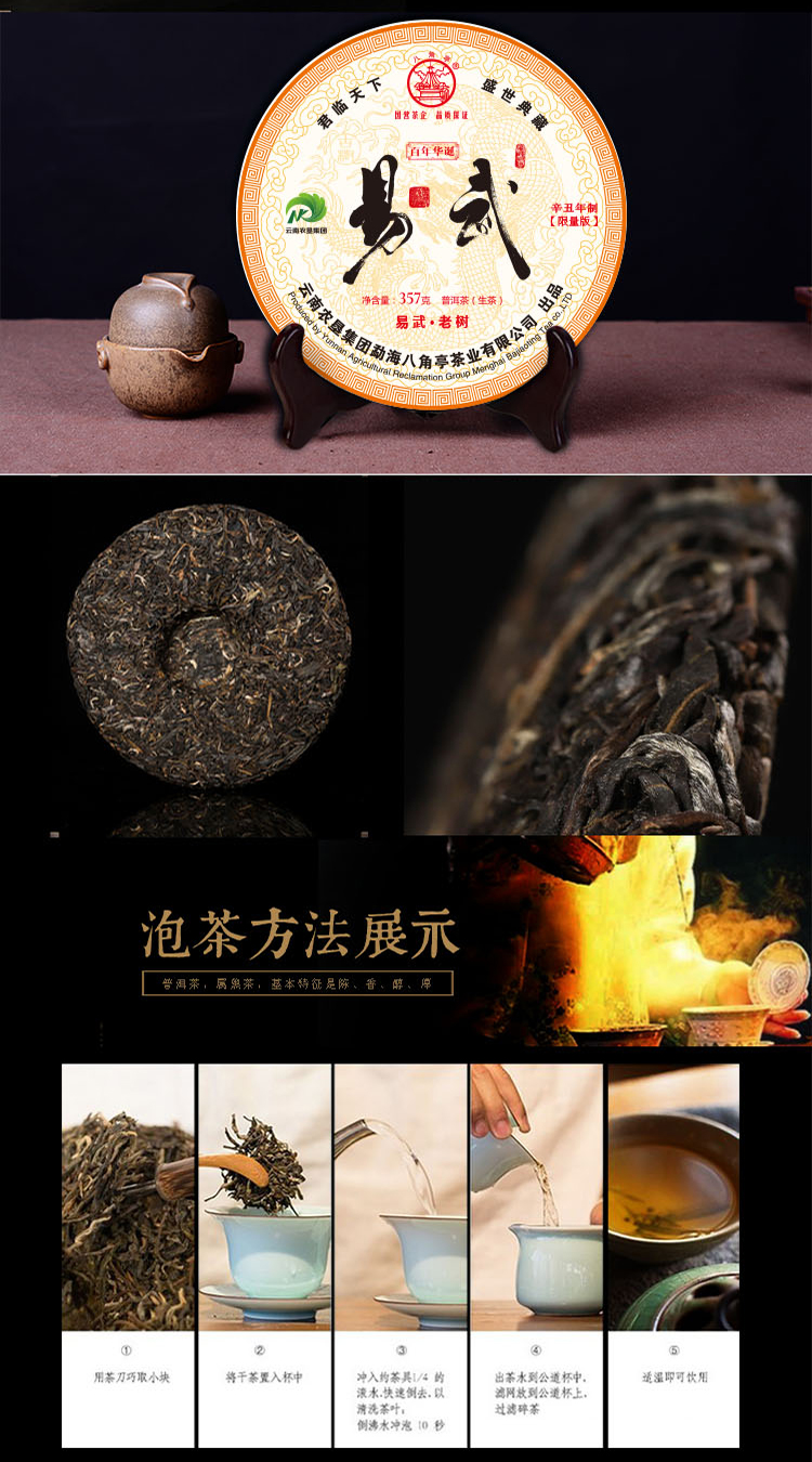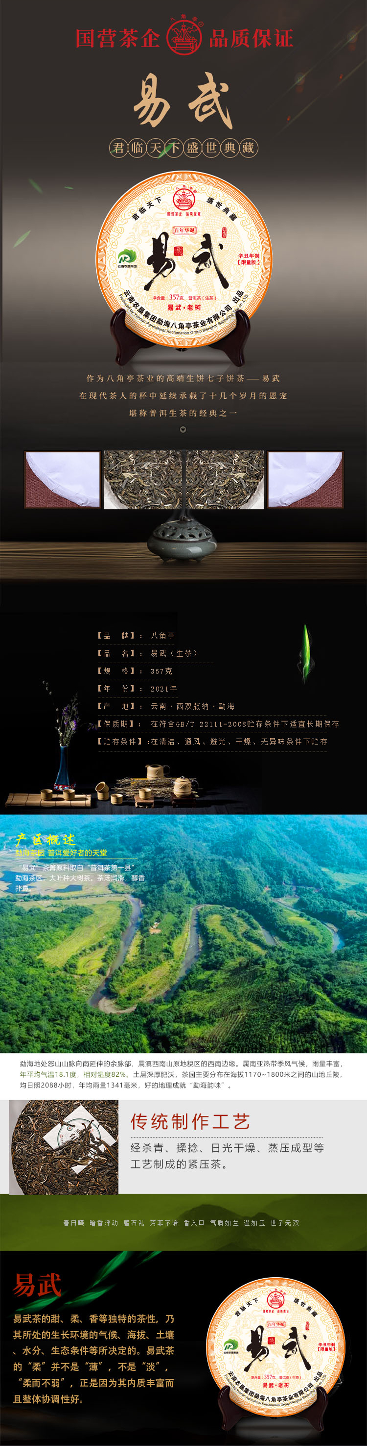 ??——八角亭茶業(yè)公司:經(jīng)營方式為生產(chǎn)加工、銷售,主營普洱茶、緊壓茶、兼營毛茶收購。目前以生產(chǎn)、加工、銷售“八角亭”系列普洱茶為主,是云南省農(nóng)業(yè)產(chǎn)業(yè)化龍頭企業(yè)?!鞍私峭ぁ鄙虡双@得云南省著名商標,“八角亭”牌普洱茶榮獲云南省名牌產(chǎn)品和云南省名牌農(nóng)產(chǎn)品。已先后通過工業(yè)生產(chǎn)許可證、ISQ9001與HCCP認證、云茶牌認證(YC)等項工作,在歷次專業(yè)評比中“八角亭”普洱茶多次獲得特等金獎和金獎。2017年5月,“八角亭”牌老班章茶葉獲得了有機茶資格認證。八角亭茶業(yè)公司多次進行了技術改造,現(xiàn)已建立了標準化生產(chǎn)車間和設備,年設計生產(chǎn)量達3000噸,是整個公司的主體核心企業(yè)。
